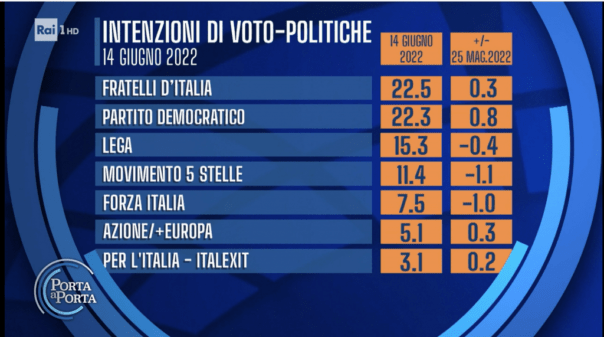 Secondo la tabella pubblicata il Pd (22,3%) ormai tallona FdI (22,5%), la Lega cala al 15,3%, Forza Italia di Berlusconi, ancora sotto attacco della magistratura, scende di un punto al 7,5%. Bene Azione e Italexit, anche Renzi, arrivando al 2,8%, si avvicina finalmente alla soglia di sbarramento del 3%.