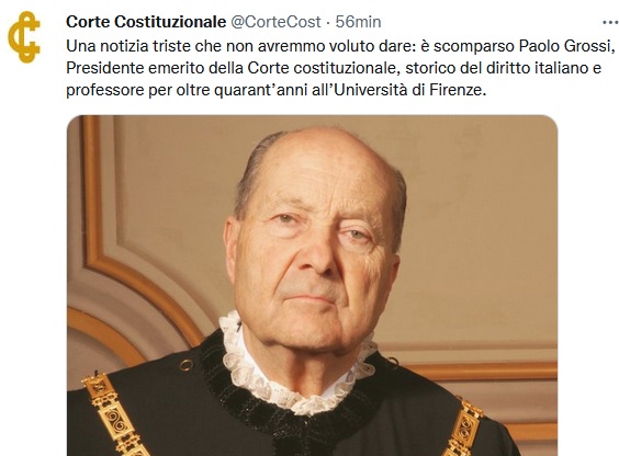 FIRENZE – E’ morto il professor Paolo Grossi, presidente emerito della Corte costituzionale. Lo si legge sul sito della stessa Consulta ” Una notizia triste che non avremmo voluto dare: è scomparso Paolo Grossi, Presidente emerito della Corte costituzionale, storico del diritto italiano e professore per oltre quarant’anni all’Università di Firenze”. Aveva 89 anni.