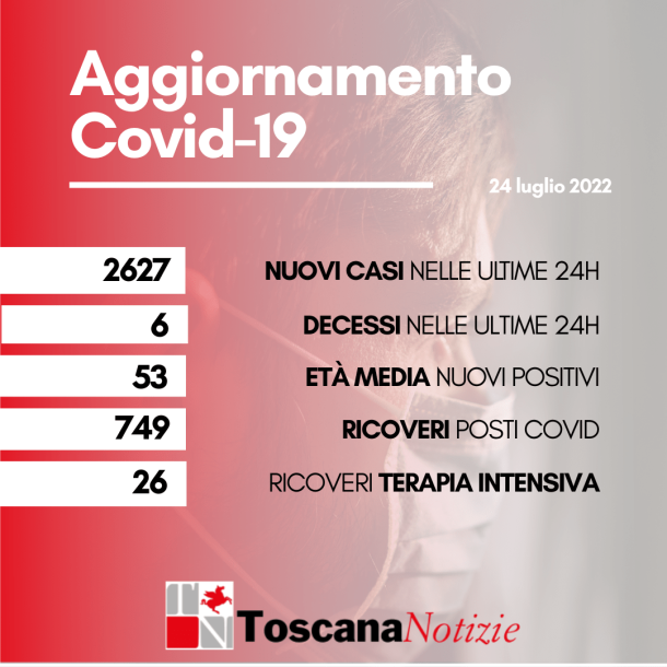 Covid Toscana: 6 morti (età media 86,3 anni), oggi 24 luglio e 2.627 nuovi contagi