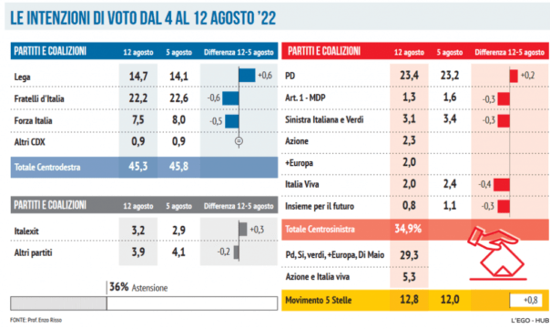 Un dato interessante che emerge dal sondaggio è che al momento l’astensione in vista delle elezioni politiche sarebbe del 36%, una percentuale più alta rispetto al 2018 quando alla fine si recarono ai seggi il 73% degli italiani