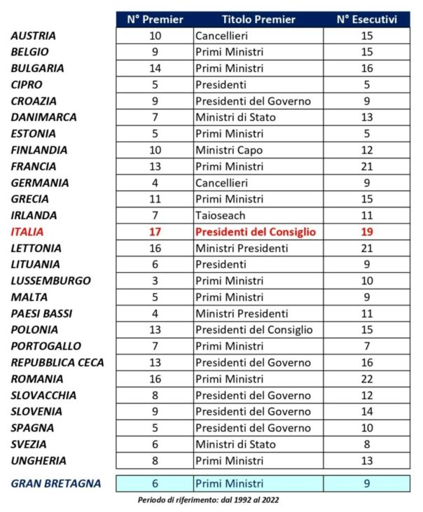 Se l’Italia è prima nel numero di premier cambiati, non è comunque da meno sul numero di esecutivi succedutisi negli ultimi 30 anni (19), collocandosi subito dietro la Romania (22) e la Lettonia (21).