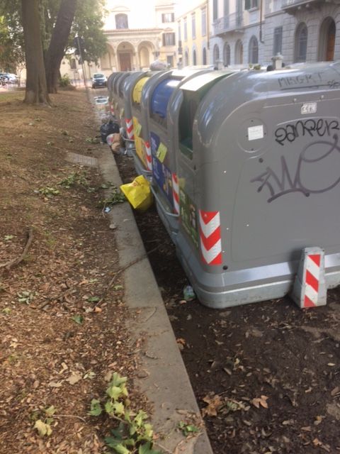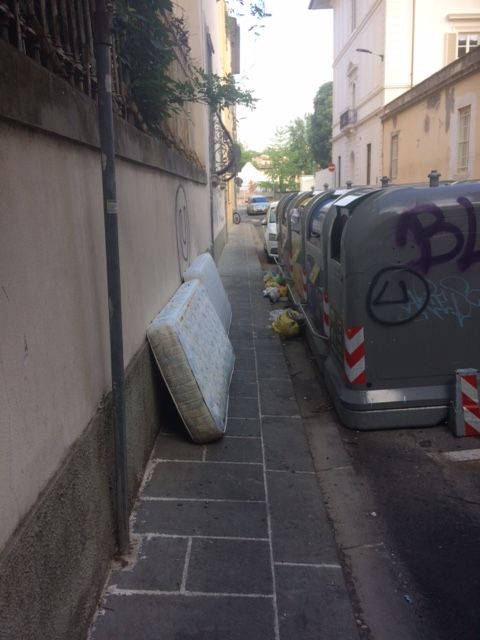 RIFIUTI – Infine l’annoso problema dei rifiuti, dei cassonetti pieni, aggravato dalle ultime innovazioni dei cassonetti con chiavetta elettronica, insufficienti come numero e sempre stracolmi. Le persone saranno anche incivili, ma talvolta sono costrette a fare di necessità virtù per via dell’inefficienza dei servizi pubblici. Qui sotto ulteriore esempio di deficienze del servizio di raccolta fiorentino.