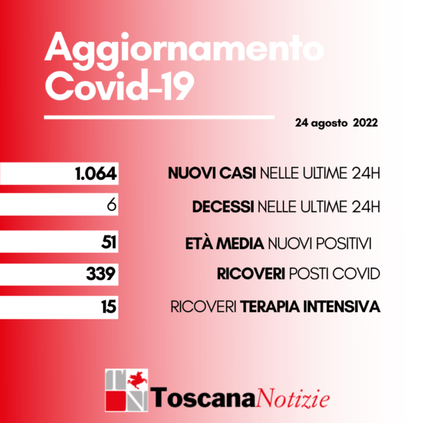 FIRENZE – In Toscana oggi 24 agosto sono 6 i nuovi decessi: 4 uomini e 2 donne con un’età media di 77,2 anni (2 a Firenze, 2 a Prato, 2 a Pistoia). Sono 1.370.123 i casi di positività al Coronavirus, 1.064 in più rispetto a ieri (198 confermati con tampone molecolare e 866 da test rapido antigenico). I nuovi casi sono lo 0,1% in più rispetto al totale del giorno precedente. I guariti crescono dello 0,1% e raggiungono quota 1.276.904 (93,2% dei casi totali). Oggi sono stati eseguiti 1.034 tamponi molecolari e 7.735 tamponi antigenici rapidi, di questi il 12,1% è risultato positivo. Sono invece 1.692 i soggetti testati oggi (con tampone antigenico e/o molecolare, escludendo i tamponi di controllo), di cui il 62,9% è risultato positivo. Gli attualmente positivi sono oggi 82.598, -0,4% rispetto a ieri. I ricoverati sono 339 (13 in meno rispetto a ieri), di cui 15 in terapia intensiva (4 in meno).