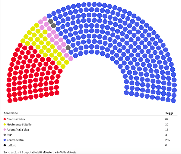 L’esito delle elezioni, che è stato simulato 10.000 volte, stando a Bidimedia, sarebbe già chiaro: senza contare gli 8 deputati eletti all’estero e quello in Valle d’Aosta, alla Camera il centrodestra dovrebbe ottenere 255 seggi su un totale di 400.