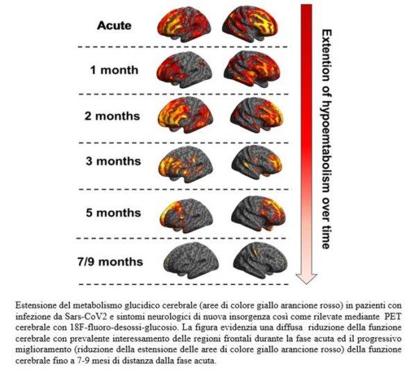 Riportato dall’ ‘European Journal of Nuclear Medicine and Molecular Imaging’, lo studio su pazienti con sintomi neurologici da Covid durante il periodo pandemico evidenzia per la prima volta che il Covid può determinare importanti alterazioni della funzione neuronale cerebrale, in particolare nelle regioni frontali durante la fase acuta della malattia e tali alterazioni si riducono nel tempo fino quasi a scomparire a partire dal terzo mese dall’ infezione.