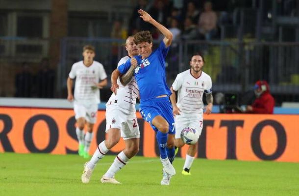 Al 37′ l’Empoli chiede il fallo di mano di Ballo-Touré, su conclusione di Haas, ma il replay chiarisce che il pallone ha colpito il fianco del difensore in scivolata. L’ultima occasione della prima parte del match è di Leao che calcia di potenza sull’esterno della rete. Nella ripresa inizia molto meglio l’Empoli: occasione per Marin, che sfiora il palo da fuori area, poi un colpo di testa di Lammers pericoloso. Luperto rischia l’autogol con una deviazione su punizione di Tonali su cui Vicario ha fatto il miracolo. Bajrami sbaglia un gol davanti a Tatarusanu.