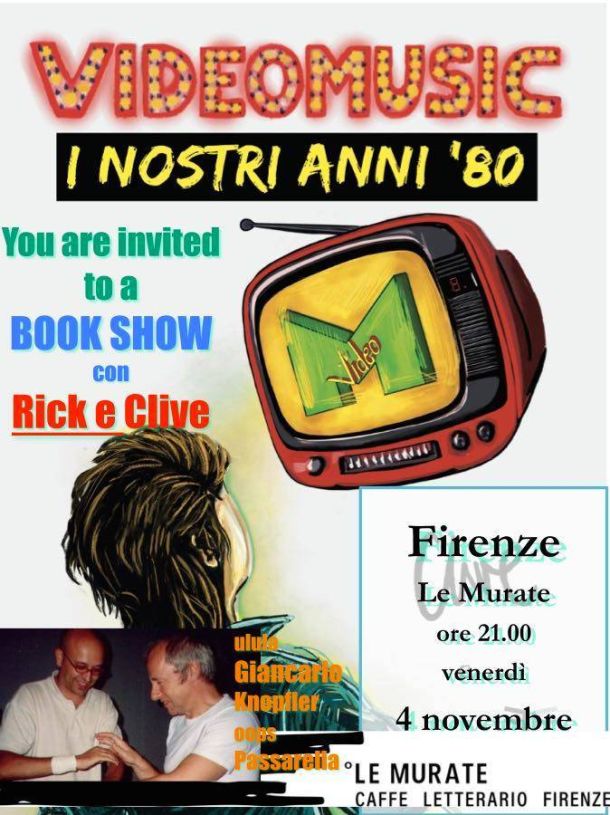 FIRENZE – Rick Hutton e Clive Malcom Griffiths saranno, insieme a Giancarlo Passarella, a Le Murate Caffè Letterario (Piazza delle Murate) venerdì 4 novembre alle 21 per presentare il libro «Videomusic – I nostri anni ’80», fra aneddoti, ricordi e siparietti (ingresso libero; prenotazione facoltativa scrivendo a caffeletterariofirenze.info@gmail.com).