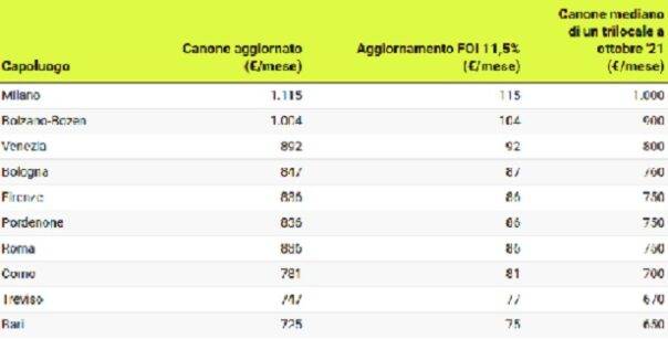 Gli inquilini che vedranno aumentare maggiormente i canoni di locazione sono quelli di Milano (+115 euro al mese e 1.380 euro in più all’anno), dove la media degli affitti è la più cara d’Italia. Aumenti significativi anche per chi vive in un trilocale in affitto a Bolzano, dove ci vorranno 104 euro in più al mese (1.248 euro in più all’anno).