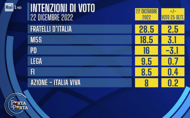 ROMA – L’ultimo sondaggio politico di Noto, reso noto in data 22 dicembre dalla trasmissione Porta a Porta, ci ha fornito quella che sarebbe la situazione dei vari partiti tre mesi dopo le elezioni dello scorso 25 settembre. Ecco le percentuali attribuite ai principali partiti, fra parentesi la differenza rispetto alle elezioni 2022: FdI 28,5% (+2,5), M5S 18,5% (+3,1), PD 16% (-3,1), Lega 9,5% (+0,7), Forza Italia 8,5% (+0,4), Azione.Italia Viva 8% (+0,2).