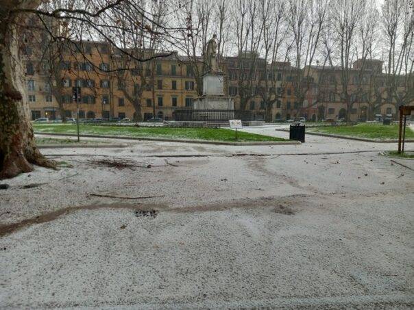 Strade imbiancate a Pisa a causa di un abbondante grandinata che ha creato rallentamenti alla circolazione stradale. Qui si sono verificati rovesci de lla cosiddetta “neve tonda” (graupel) con una veloce imbiancata su gran parte della città. In meteorologia la neve tonda è una precipitazione atmosferica solida, costituita da palline di ghiaccio bianche e opache. Solitamente tale fenomeno viene a generarsi in presenza di un nocciolo di aria molto fredda in alta quota.