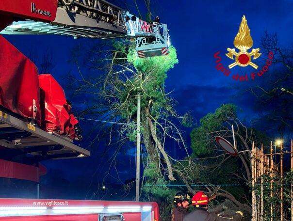 Non ci sono persone coinvolte. I Vigili del fuoco hanno utilizzato un mezzo aereo e l’autogru per la rimozione dell’albero.