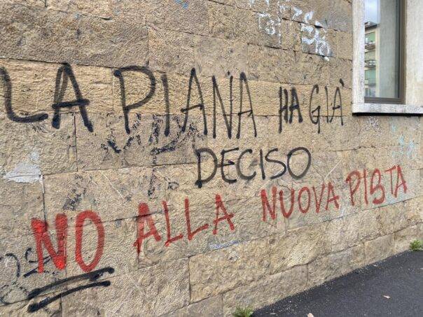 FIRENZE – Una scritta sul muro, con bomboletta nera e rossa, che dice ‘La piana ha già deciso, no alla nuova pista’, è comparsa sul muro del Camplus di Firenze dove stamattina, 4 febbraio 2023, era in programma un incontro organizzato da Italia Viva Firenze per ribadire il sostegno alla nuova pista dell’aeroporto di Peretola. Lo riportano sui social Raffaella Paita, senatrice Iv e capogruppo del Terzo polo al Senato e Gabriele Toccafondi, consigliere comunale Iv a Sesto Fiorentino.