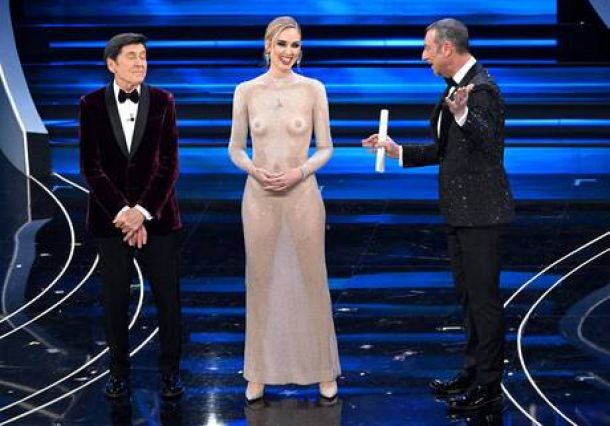 E ieri sera? Riprendo la cronaca da dove l’ho lasciata, cioè all’esibizione dei Pooh. Quindi dal monologo di Chiara Ferragni: si presenta in scena con un vestito naked dress con un ricamo trompe l’oeil del suo corpo: “Non sono nuda – spiega – è un disegno del mio corpo”.