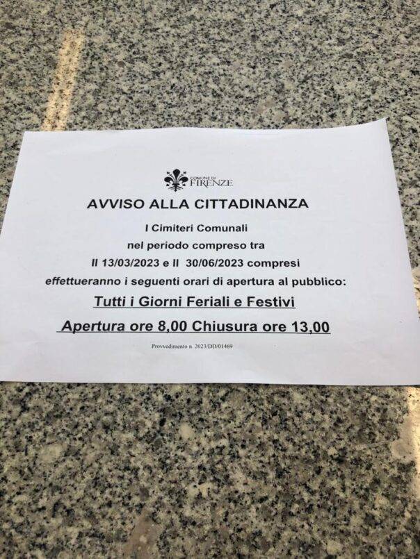FIRENZE – Forti proteste contro la disposizione di Palazzo Vecchio che chiude i cimiteri comunali nel pomeriggio, dal 13 marzo al 30 giugno 2023. L’orario di apertura sarà soltanto dalle 8 alle 13. Niente deroghe nemmeno per il fine settimana. Molti fiorentini sono irritati da questa decisione, che taglia fuori soprattutto coloro che lavorano e che approfittavano delle ore pomeridiane per andare a mettere un fiore o un lumino sulla tomba di chi non c’è più.