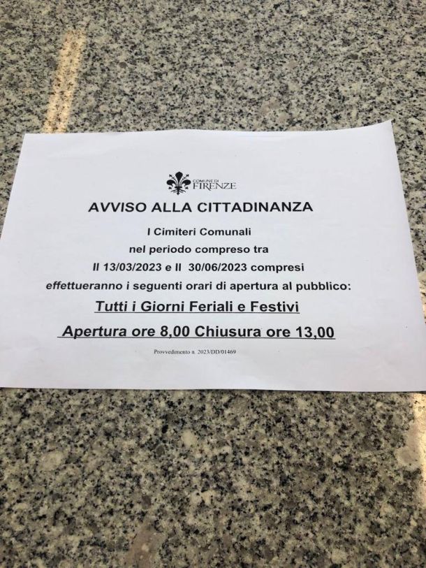 FIRENZE – Forti proteste contro la disposizione di Palazzo Vecchio che chiude i cimiteri comunali nel pomeriggio, dal 13 marzo al 30 giugno 2023. L’orario di apertura sarà soltanto dalle 8 alle 13. Niente deroghe nemmeno per il fine settimana. Molti fiorentini sono irritati da questa decisione, che taglia fuori soprattutto coloro che lavorano e che approfittavano delle ore pomeridiane per andare a mettere un fiore o un lumino sulla tomba di chi non c’è più.