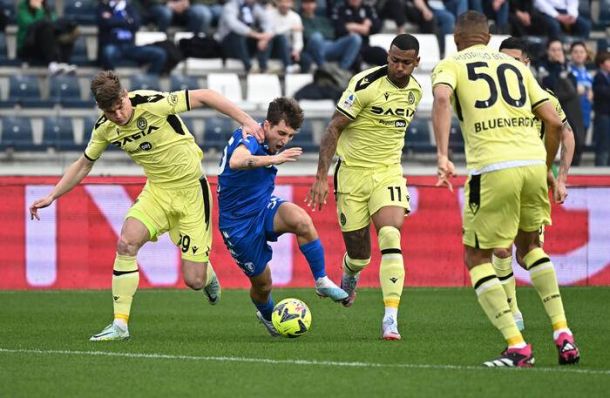La gara si decide al 9′ della ripresa quando un colpo di testa di Becao consente all’Udinese di trovare la rete del vantaggio, con gli uomini di Zanetti che come troppo spesso accaduto nelle recenti gare si lasciano sorprendere su situazione di corner a sfavore. L’Empoli nel giro di un minuto, fra il 62′ ed il 63′, sfiora due volte il pareggio, prima con un sinistro a giro di Baldanzi deviato in angolo, poi con Luperto che all’altezza del dischetto del rigore mette clamorosamente sopra la traversa.