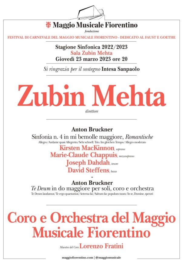 FIRENZE – Giovedì 23 marzo alle 20 al Teatro del Maggio Musicale Fiorentino il direttore emerito Zubin Mehta sarà nella sala a lui intitolata alla guida del Coro e dell’Orchestra del Maggio per un concerto interamente dedicato ad Anton Bruckner; in programma la Sinfonia n. 4 in mi bemolle maggiore Romantische e il Te Deum in do maggiore per soli, coro e orchestra; solisti Kirsten MacKinnon, Marie-Claude Chappuis, Joseph Dahdah e David Steffens.