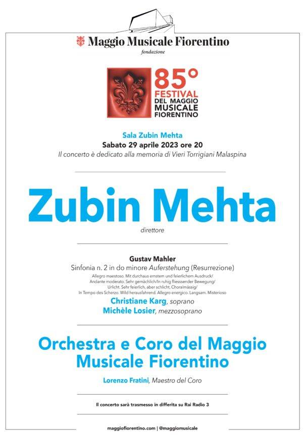 FIRENZE – Zubin Mehta sabato 29 aprile festeggia l’87° compleanno nel modo che gli è più congeniale: dirigendo, nell’ambito dell’85° Festival del Maggio Musicale Fiorentino, l’Orchestra e il Coro del Maggio, di cui è direttore emerito a vita, nella Sinfonia n. 2 in do minore per soli, coro e orchestra, Auferstehung (Resurrezione) di Gustav Mahler, solisti il soprano Christiane Karg e il mezzosoprano Michèle Losier; maestro del Coro Lorenzo Fratini; già esauriti i biglietti in vendita online (da 20 a 70 euro) per la Sala Mehta del Teatro del Maggio Musicale Fiorentino; non c’è che sperare nei pochi che usualmente la biglietteria tiene da vendere subito prima del concerto.