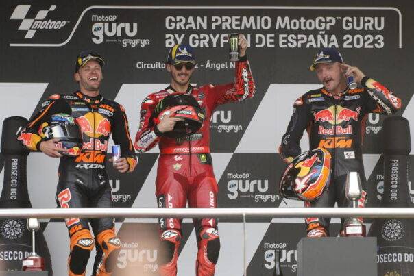 JEREZ (SPAGNA) – Francesco “Pecco” Bagnaia si è preso la rivincita su Brad Binder, che ieri, 29 aprile 2023, l’aveva preceduto sul traguardo nella gara sprint, vincendo il Gp di Spagna e salendo in vetta alla classifica del Mondiale MotoGp, con 22 punti di vantaggio su Marco Bezzecchi, sfortunato nel fine settimana di Jerez.