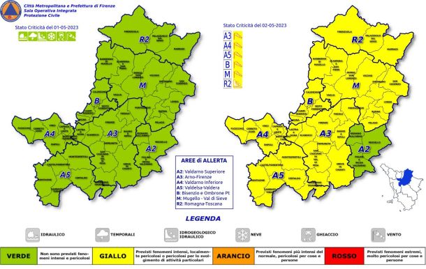 FIRENZE – La Protezione Civile ha diramato per domani, 2 maggio 2023, dalla mattina e fino alla tarda serata, un codice giallo per rischio idraulico idrogeologico del reticolo minore area R2 Romagna Toscana e rischio Vento nelle restanti aree, escluso area A2-Arno-Valdarno Sup. Previsto vento forte da Nord N/E con raffiche fino a 50-60 km/h sulle zone di pianura, fino a 60-80 km/h su quelle di collina, fino a 80-100 km/h sui crinali.