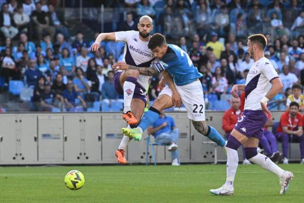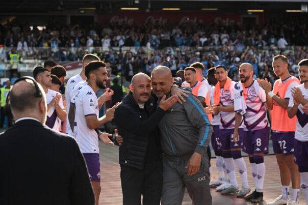PAOLO SORRENTINO – Il ‘Maradona’ tirato a lucido per l’occasione, con ospiti illustri come il regista premio Oscar Paolo Sorrentino e il tecnico dell’Atletico Madrid Diego Simeone, accoglie i campioni d’Italia con una splendida coreografia tricolore, e il 3 come il numero degli scudetti in bella mostra in mezzo. Gli oltre 50mila presenti nell’impianto di Fuorigrotta cantano e strombazzano ma fuori dallo stadio un fiume di tifosi si stringe virtualmente attorno a Di Lorenzo e compagni. Non ci sono praticamente i tifosi viola, dopo che la “Fiesole” ha deciso di disdertare la trasferta. Lo spettacolo è fuori dal campo e quello che succede dentro il rettangolo verde conta fino a un certo punto. Sarà per questo che la Fiorentina, dopo aver concesso il ‘pasillo de honor’ ai padroni di casa al loro ingresso in campo, non fa sconti appena l’arbitro fischia l’inizio del match. I viola vogliono prendersi l’ottavo posto in solitaria e, pur facendo delle rotazioni ragionate in vista della semifinale di Conference League, partono forte e creano subito due occasioni con Jovic, che trova sulla sua strada un ottimo Gollini.