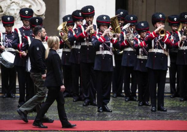 Ore 13:02 – La presidente del Consiglio, Giorgia Meloni, ha accolto il presidente ucraino, Volodymyr Zelensky, nel cortile di Palazzo Chigi. Fra i due c’è stato un abbraccio, seguito da una stretta di mano davanti alle telecamere nel cortile di Palazzo Chigi, dove Zelensky è stato accolto dal picchetto con gli onori militari.