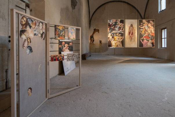 Oltre le mura di Sant’Orsola segna l’inizio di una serie di incontri con il pubblico, alla scoperta di uno spazio in continua evoluzione. Un museo effimero, destinato a durare solo un mese per poi cambiare ancora, ma in grado di consentire ai visitatori di accedere a Sant’Orsola prima dell’apertura ufficiale del museo stesso e dell’intero complesso; raccoglie i risultati della ricerca di due diversi artisti contemporanei che hanno realizzato delle opere d’arte originali, ispirandosi alla storia del luogo e ad elementi del suo passato. Sophia Kisielewska-Dunbar, classe 1990, è un’artista e storica dell’arte londinese. La fascinazione per l’antico e la reinterpretazione di iconografie tradizionali sono il cuore della sua pratica artistica, che indaga le modalità di rappresentazione della donna nel canone dell’arte occidentale. Dal 15 giugno al 15 settembre 2022 è stata la prima artista in residenza del futuro Museo Sant’Orsola. In occasione di questa prima mostra, presenterà al pubblico il suo progetto monumentale, intitolato Noli me tangere (‘non mi toccare’): un grandioso trittico dipinto ad olio su tela ispirato alle pale d’altare che anticamente si trovavano nel convento. Ciascuna delle figure che affollano i pannelli laterali del trittico è estrapolata da pitture, disegni o bassorilievi fiorentini, raffiguranti scene di violenza sulle donne e realizzati nei medesimi anni dell’attività del monastero di Sant’Orsola. Usando la tecnica del collage in pittura, Sophia ha immaginato una contro-narrazione, per rivendicare lo sguardo femminile che per secoli è stato escluso dal canone dell’arte occidentale. L’esposizione del trittico sarà accompagnata da una selezione di più studi preparatori tra cui disegni, acquerelli e dipinti.