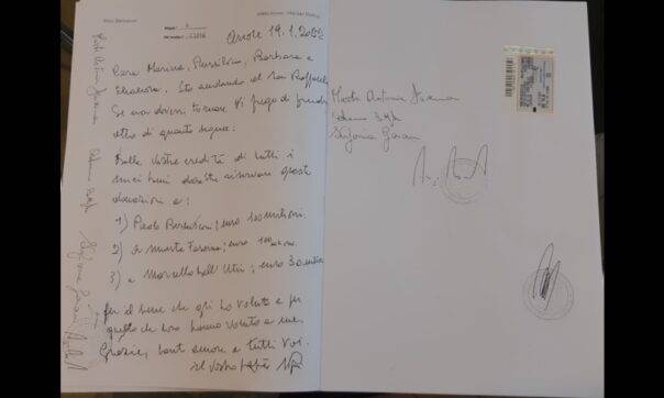 La lettera è su carta intestata ‘Silvio Berlusconi’ e ‘Villa San Martino’. Nominando i figli curiosamente non viene menzionato Luigi, il più giovane.