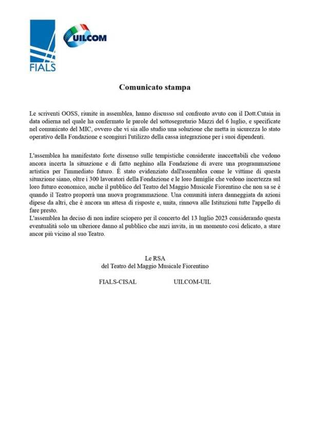 Firmato: l’assemblea delle lavoratrici e dei lavoratori, iscritti e simpatizzanti di Cgil e Cisl, del Maggio Musicale Fiorentino
