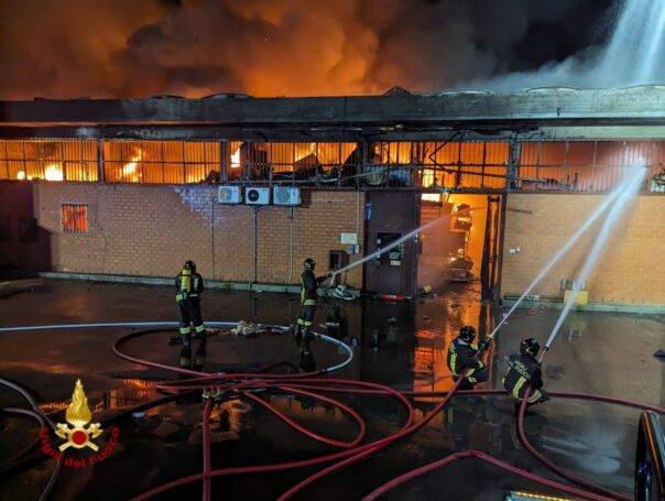 I Vigili del fuoco informano che l’incendio è stato estinto ma ci sono ancora alcuni punti, all’interno del capannone, dove permangono dei focolai a causa dell’elevata concentrazione di materiale in deposito. Il personale VF continua con le operazioni di bonifica e di spegnimento.