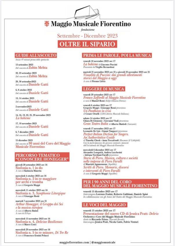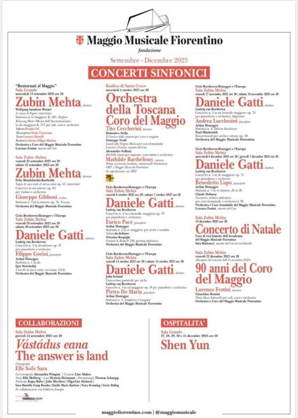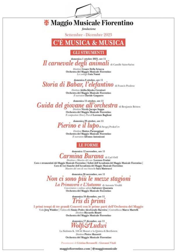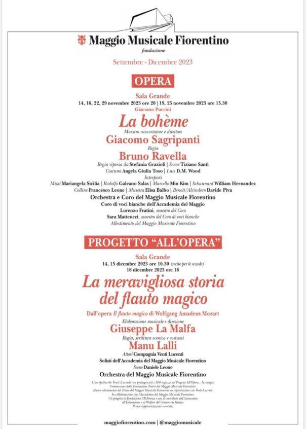 Dopo l’inaugurazione del 13 settembre, ci sono in programma per il 2023 altri otto concerti (oltre a quello che il Coro del Maggio farà con l’Orchestra della Toscana nella Basilica di Santa Croce il 4 ottobre), un’opera, ovvero la ripresa della Bohème di Puccini con la regia di Bruno Ravella (sul podio Giacomo Sagripanti) e un fitto ciclo di iniziative per bambini, che si cerca di attirare in teatro la domenica mattina con due cicli di spettacoli, uno in cui si presentano gli strumenti musicale e uno in cui si illustrano le forme delle composizioni; il palco si accende alle 11, ma i bambini e le famiglie possono entrare ben prima a vivere il teatro (e fruire della colazione offerta); sempre per i giovanissimi è in cartellone a dicembre La meravigliosa storia del flauto magico.