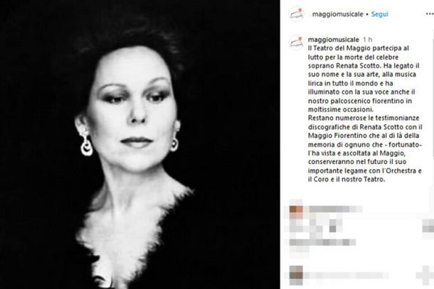 FIRENZE – Renata Scotto, grande soprano dalla lunga e luminosa carriera, che spesso ha fatto tappa anche al Maggio Musicale Fiorentino, è morta all’improvviso nella sua casa di New York e il mondo della lirica piange uno dei soprani più famosi al mondo. “Ho il cuore a pezzi” ha scritto sui social Placido Domingo definendola “una dei più grandi cantanti lirici di tutti i tempi, una insegnante dedicata ai giovani cantanti e per me, personalmente, una dei partner più assidui sul palco, con più di cento rappresentazioni insieme”, ma “soprattutto una carissima amica”.