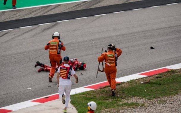 La gara viene fermata e l’ambulanza entra in pista per portare il campione del mondo della Ducati al centro medico dell’autodromo spagnolo.