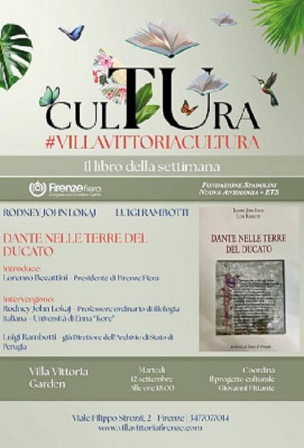 FIRENZE – Nuovo appuntamento a Villa Vittoria Cultura (V.le Filippo Strozzi, 2, Firenze) con “Il libro della settimana”; martedì 12 settembre alle 18 verrà presentato il volume Dante nelle terre del Ducato, a cura di Rodney Lokaj, professore ordinario di Filologia italiana all’Università “Kore” di Enna, e Luigi Rambotti, già Direttore dell’Archivio di Stato di Perugia. Dopo il saluto introduttivo del presidente di Firenze Fiera, Lorenzo Becattini, interverranno i due autori che presenteranno le tematiche principali del libro che rappresenta un nuovo prezioso contributo sugli studi danteschi. Tutto è partito con il ritrovamento di nuovi frammenti danteschi dopo il terremoto del 2016 che colpì importanti centri del centro Italia come Amatrice e Norcia e la conseguente messa in sicurezza di beni artistici dalle zone terremotate. Da Norcia, con svariate opere d’arte, venne prelevato e trasferito a Spoleto, per la ripulitura e le opportune schedature, anche il fondo archivistico. Da qui il rinvenimento di alcuni frammenti danteschi (fra i quali brandelli di pergamena recanti passi forse ascrivibili alla Commedia) che spinsero l’allora direttore dell’Archivio di Stato (sezione di Spoleto) Luigi Rambotti, ad affidare a Rodney Lokaj la ricognizione più sistematica della presenza di Dante sul territorio, sia nei documenti custoditi da tempo, sia in quelli scampati al terremoto.