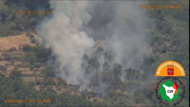 PRATO – Un vasto incendio boschivo è in corso dalle 11 di questa mattina, 14 settembre 2023, in località Schignano, nel comune di Vaiano (Prato). Le fiamme interessano una pineta attraversata da alcune linee di alta tensione che rendono difficili gli sganci dei due elicotteri inviati dalla Sala operativa regionale.