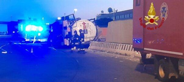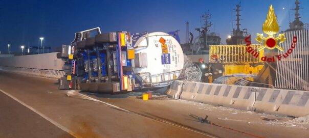 Secondo una prima ricostruzione, l’autocisterna si sarebbe ribaltata a seguito di una manovra errata all’interno della zona del porto industriale. L’autista non avrebbe riportato ferite né risulterebbero altre persone coinvolte nell’incidente.