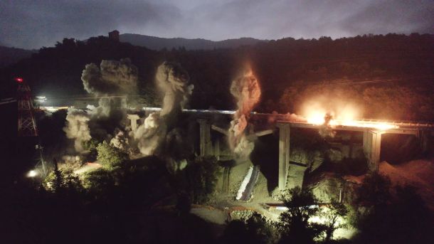 Le operazioni di brillamento, coordinate da Amplia società del Gruppo Aspi e prima azienda di costruzioni per attività a livello nazionale, sono state precedute da fasi di demolizione meccanica di piccole parti dell’opera, finalizzate anche al posizionamento del materiale esplosivo in punti strategici individuati con l’obiettivo di garantire la demolizione in massima sicurezza dell’impalcato ma anche la salvaguardia delle sottostrutture. Alla base dei piloni in particolare sono state posizionate delle cuffie di protezione al fine di attutire le vibrazioni generate dalla detonazione.