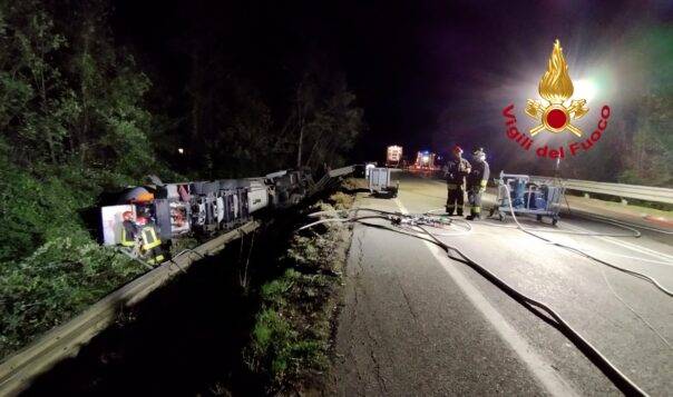I Vigili del fuoco giunti sul posto, hanno verificato la situazione dell’automezzo e garantito la sicurezza durante le fasi di soccorso al conducente, rimasto all’interno della cabina di guida, estratto dai Vigili del fuoco e affidato alle cure del personale sanitario. La squadra dei vigili del fuoco è rimasta sul posto in attesa di effettuare il travaso dei 40.000 litri di gas GPL.