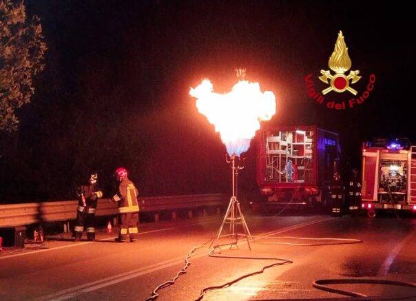 Con l’arrivo del nucleo NBCR specializzato nei travasi di sostanze pericolose giunto dal Comando di Venezia in supporto al Nucleo Biologico Chimico Radiologico di Firenze, sono iniziate in serata le operazioni di allestimento e di preparazione delle attrezzature che consentiranno di trasferire i 40.000 litri di gas GPL dalla cisterna incidentata ad una altra.