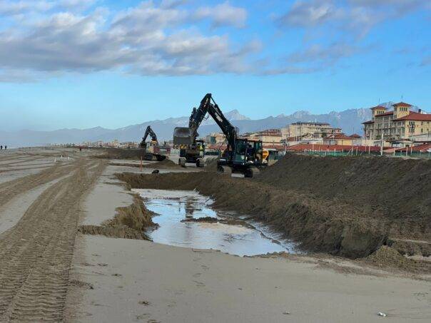 VIAREGGIO (LUCCA) – La Protezione civile ed il Comune di Viareggio e la Protezione civile nel corso della notte scorsa, 4 novembre, hanno fatto realizzare a tempo di record, da una ditta specializzata, una duna di sabbia continua alta due metri a partire dalla spiaggia vicino al molo fino alla fossa dell’Abate al confine con Lido di Camaiore. La duna servirà a fronteggiare ulteriori mareggiate che, già nella giornata di ieri, 3 novembre, hanno provocato danni da allagamenti in vari stabilimenti balneari in Versilia minacciando anche la vicina passeggiata, il viale dove per il Carnevale sfilano i carri allegorici.