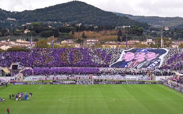 CURVA FIESOLE – Per i 50 anni degli ultras, la Curva Fiesole sfodera la coreografia che doveva essere esposta con la Juve. Lo “sciopero” per il mancato rinvio della partita con i bianconeri per l’alluvione, ha imposto il rinvio. Compare la coreografia con il “50” e tre facce dei “fondatori”. Uno potrebbe essere il mitico “Pompa”.