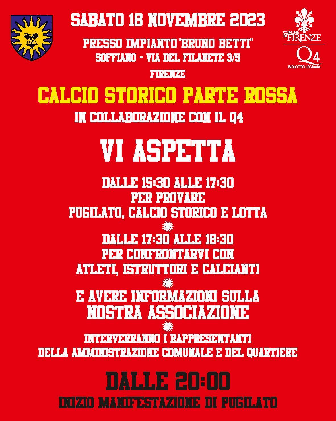 FIRENZE – L’Associazione Calcio Storico di Parte Rossa Asd e il Quartiere 4 organizzano la manifestazione Uniti Per Crescere con lo Sport, che si svolgerà presso il Campo di atletica Bruno Betti, in via del Filarete 3-5, a Firenze, sabato 18 novembre 2023, dalle 15.30 alle 23 circa, con il seguente programma: