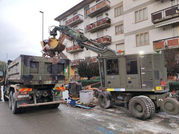 Mezzi dell’esercito impegnati nella pulizia delle strade a Campi Bisenzio (foto dal profilo FB di Giani)
