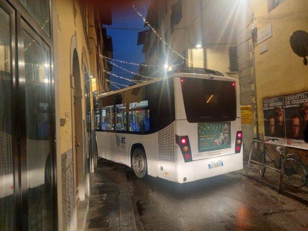 FIRENZE – Centro storico semiparalizzato, oggi 30 novembre 2023, per via di un bus urbano di Autolinee Toscane, a quanto pare fuori servizio, rimasto incastrato nelle stradine vicino a Piazza Santa Maria Novella.