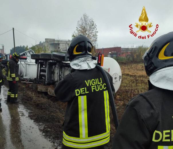 MONTALE (PISTOIA) – Pauroso incidente stradale stamattina, 30 novembre 2023, in provincia di Pistoia. Diverse squadre dei Vigili del Fuoco sono intervenute a Montale in via Garibaldi per il ribaltamento di una cisterna semirimorchio carica di GPL. La cisterna è rimasta adagiata su un fianco a bordo strada. I vigili sono al lavoro dalle 10.30, per il momento non si registrano perdite di combustibile e non risultano feriti nell’incidente.
