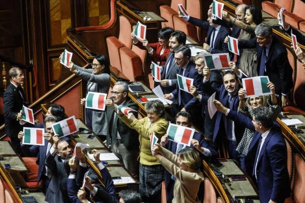Nessuno però poteva immaginare che il risultato del voto sulla legge sulla devoluzione alle Regioni sarebbe stato anticipato dal canto patriottico per eccellenza: Fratelli d’Italia di Goffredo Mameli. E’ andata così, i senatori Pd e M5s hanno intonato le prime note, seguiti dal resto delle opposizioni, il centrodestra allora non ha perso l’occasione per accodarsi. Tutti in piedi a cantare.