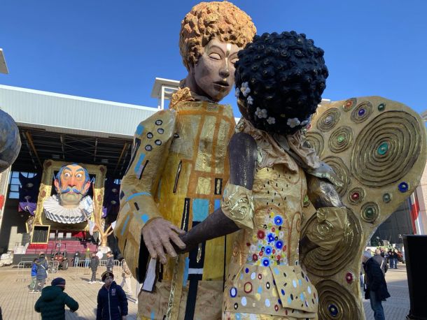 Le allegorie di Putin e Zelensky sono presenti anche in un’altura mascherata, I Camaleonti di Marzia Etna: in questa però i leader di Russia e Ucraina sono accompagnati anche da Benjamin Netanyahu e Xi Jinping. A spiccare tra i mascheroni in cartapesta della mascherata di gruppo di Stefano Di Giusto dal titolo Pace è quello che raffigura Joe Biden. Il presidente americano è in sella ad un grande missile: accanto a lui, a bordo di carri armati e altri mezzi di guerra, ci sono anche il ministro della Difesa Guido Crosetto e la presidente del consiglio Giorgia Meloni, la leader del Pd Elly Schlein e il presidente della Repubblica Sergio Mattarella, l’unico che sventola una bandiera della pace.