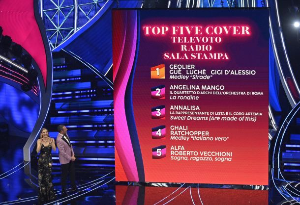 CLASSIFICA – Geolier con Luchè, Guè e Gigi D’Alessio si aggiudica il primo posto nella top five della serata delle cover. Seconda Angelina Mango, terza Annalisa con La Rappresentante di Lista e Coro Artemia, quarto Ghali con Ratchopper, quinto Alfa con Roberto Vecchioni. La classifica è stata stilata attraverso il televoto da casa ed il voto di radio e sala stampa.