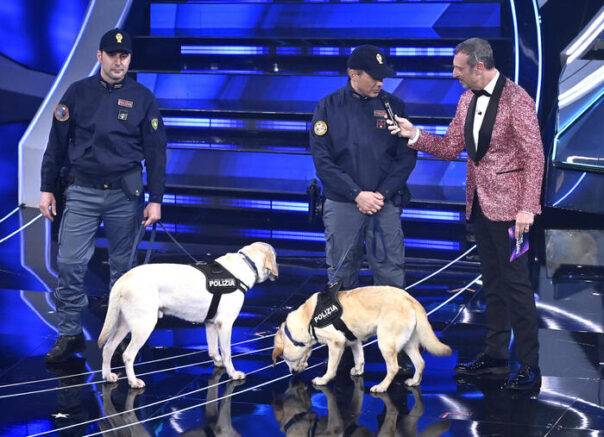 OMAGGIO AI CANI DI POLIZIA E CARABINIERI – Un ringraziamento speciale, molto apprezzato dalla cronista che scrive, ai valorosi agenti a quattro a zampe delle forze dell’ordine. Quattro cani, due dei Carabinieri e due della Polizia, impegnati in questi giorni nel servizio d’ordine a Sanremo, sono stati invitati da Amadeus a salire sul palco dell’Ariston accompagnati dai rispettivi conduttori. Gli animali sono impegnati nella ricerca di droga e ordigni. Amadeus ha quindi rivolto un ringraziamento alle decine di uomini e donne impegnate a garantire la sicurezza durante il Festival.