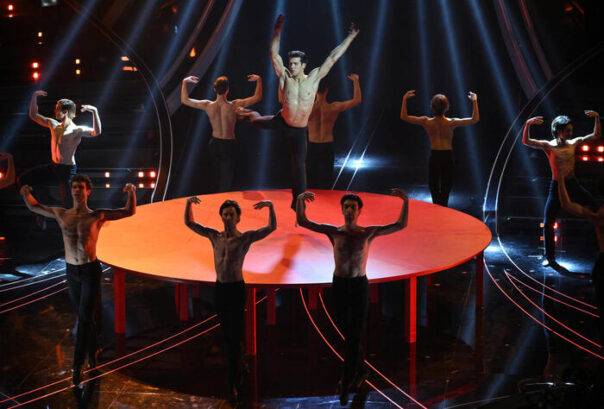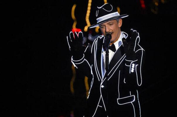 CICLONE FIORELLO – Il co-conduttore entra in scena con una rivisitazione della celebre ‘L’uomo in Frack’ su un tappeto musicale originale, un mash-up tra Domenico Modugno e Michael Jackson. Vestito con un costume luminoso con inserti led, Fiorello è stato accompagnato sul palco dai ballerini della Compagnia ucraina di danza hi tech di Kiev . “Per fare questo numero sono stato in carica tutto il pomeriggio”, ha scherzato lo showman.